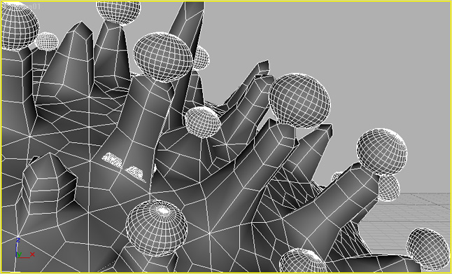 Here you can see the base mesh with no additional levels of Meshsmooth applied. The trick was how to get the very pro conspicuous nodule covered surface. My first thought was to grab individual faces from the low poly mesh that had one level of tessellation applied and extrude them slightly. When the render time Meshsmooth was added this would turn the box-like extrusions into rounded bumps. By varying the amount of extrusion and taper some degree of irregularity could be given to the surface while at the same time allowing a great deal of control as to where the bumps would be located. Unfortunately, after running a test on a section of the geometry using this method it became apparent that the uniformity of the underlying mesh would not easily be disguised. Additionally the original image had a good deal of variety in the size and placement of the nodules that would have necessitated rebuilding the base mesh to accomplish the same feel in the finished image. My second take on the surface was much less labor intensive and more straight forward. I had considered using the cellular map for displacement of the surface original but had dropped it for a couple of reasons. Firstly, while the cellular map would produce nearly a dead ringer for the majority of the surface I wasn't sure how I would be the more stretched out bumps visible on the stalks without masking them and blending them into the base surface. Secondly, Max really falls down dealing with displacement and I wasn't sure if I would be able to tessellate the surface to the desired resolution without running into memory limitations. As it turned out both of these problems were solved fairly easily. Since the base geometry had been built from a geosphere I figured that instead of basing the displacement off of the XYZ of the displacement map, I could use UVW space and spherically map the surface. This then allowed me to set the tiling of the map's W component to something less than 1.0, thereby stretching the map along the normal of the original sphere. Doing this allowed the stalks to have longer, stretched nodules along their length without having to figure out a way to blend two different displacements between the base and the stalks. As for the displacement it was all accomplished with the Displace modifier and a high level of Meshsmooth. The Displacement modifier as it turns out is much quicker and versatile to use than the displace map within the material. Until the day when micropolygon displacement is built into Brazil this is a rough but passable solution. The stalk caps were created from spheres squashed, manipulated and displaced with hand painted displacement maps and the filaments in the distance are simple splines turned into geometry with Clay Studio Pro. Lighting and shading were straightforward as I had already come up for a fairly good recipe for the SEM look on previous images. The basics of the look are produced through a falloff map where the edges are illuminated and normals closer to the camera view fade to black. The exact appearance of the falloff varies from photo to photo and can easily be changed using the mix curve controls. Subtle bumps can be added for additional detail. Lighting can almost be non existent if self illuminated materials are used but for a closer match to the real thing a strong light and simulated bounce is necessary. Brazil's skylight was just what was needed. Rendering was accomplished with an early version of Brazil. I wasn't sure how I was going to do the Depth of field based blur, but fortunately right about that time DOF was added in and allowed the background to be nicely out of focus just like the reference image. Just a hint of film grain was added in post and it was done. 11/10/02 |