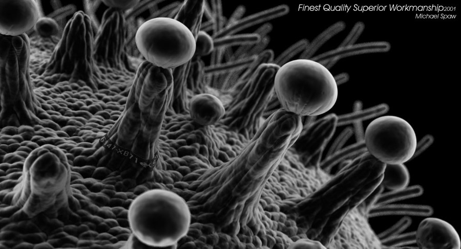 This image has an interesting back-story and I imagine that a few of you probably caught the reference in the name. If you didn't; never fear, it just means that you probably haven't watched the movie Blade Runner as many times as some of us. It's a bit of a touchstone for both sci-fi films and the design community, and it's not a bad flick to watch either. For those not familiar with the film, Deckard, a bounty hunter/cop and protagonist of the story, is trying to determine the origin of a scale he has found during his investigation. He takes the sample to a vender in synthetically replicated animals who analyzes it with a scanning electron microscope. Not only does she determine the type of animal it came from but also the manufacture, as the sample is tagged with a maker's id number. While not looking very snake skin like the image and idea behind the sequence was memorable. I had been interested in scientific imaging for several years when I started playing with replicating the look of scanning electron microscope (SEM) imagery in CG. As a result, I had been collecting interesting images off the net as well as looking for books and other publications that had something to offer along theses lines. There are a few books currently available about SEM imagery. One of the best from the laymen's point of view/reference image collector is Journeys in Microspace : The Art of the Scanning Electron Microscope - Dee Breger When the idea to replicate the Blade Runner image popped into my head I wanted to track down the original image if possible. The image in the film was naturally retouched to add the ID band and then only seen on a fairly low quality monitor on set.